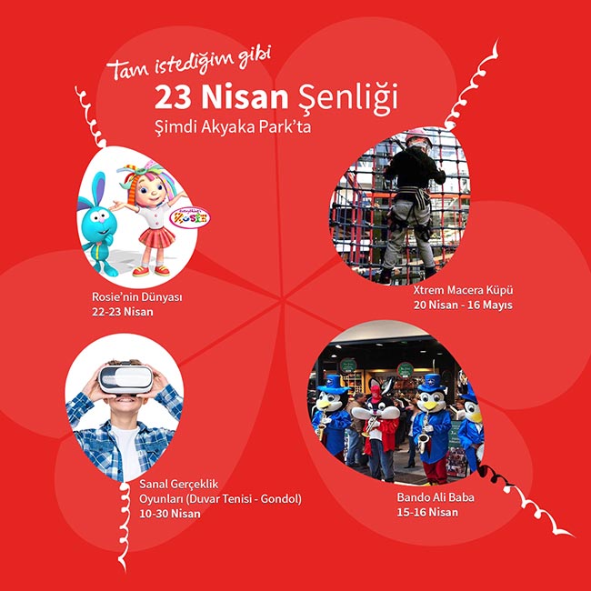 Akyaka Park’ta 10 Nisan’da başlayan 23 Nisan Çocuk Şenliği, bu hafta çocukların en sevdiği çizgi film karakterlerinden Rosie’nin alışveriş ve yaşam merkezine gelişi ile renkleniyor, temalı interaktif sanal gerçeklik oyunları ve Xtrem Macera Küpü etkinliğiyle devam ediyor. 23 Nisan Çocuk Şenliği coşkusu adrenalin dolu Xtrem Macera Küpü ve Akyaka Park’ın yeni maskotları ile ay sonuna kadar uzanırken, alışveriş merkezi 30 Nisan’da Cem Belevi konserine ev sahipliği yapıyor.